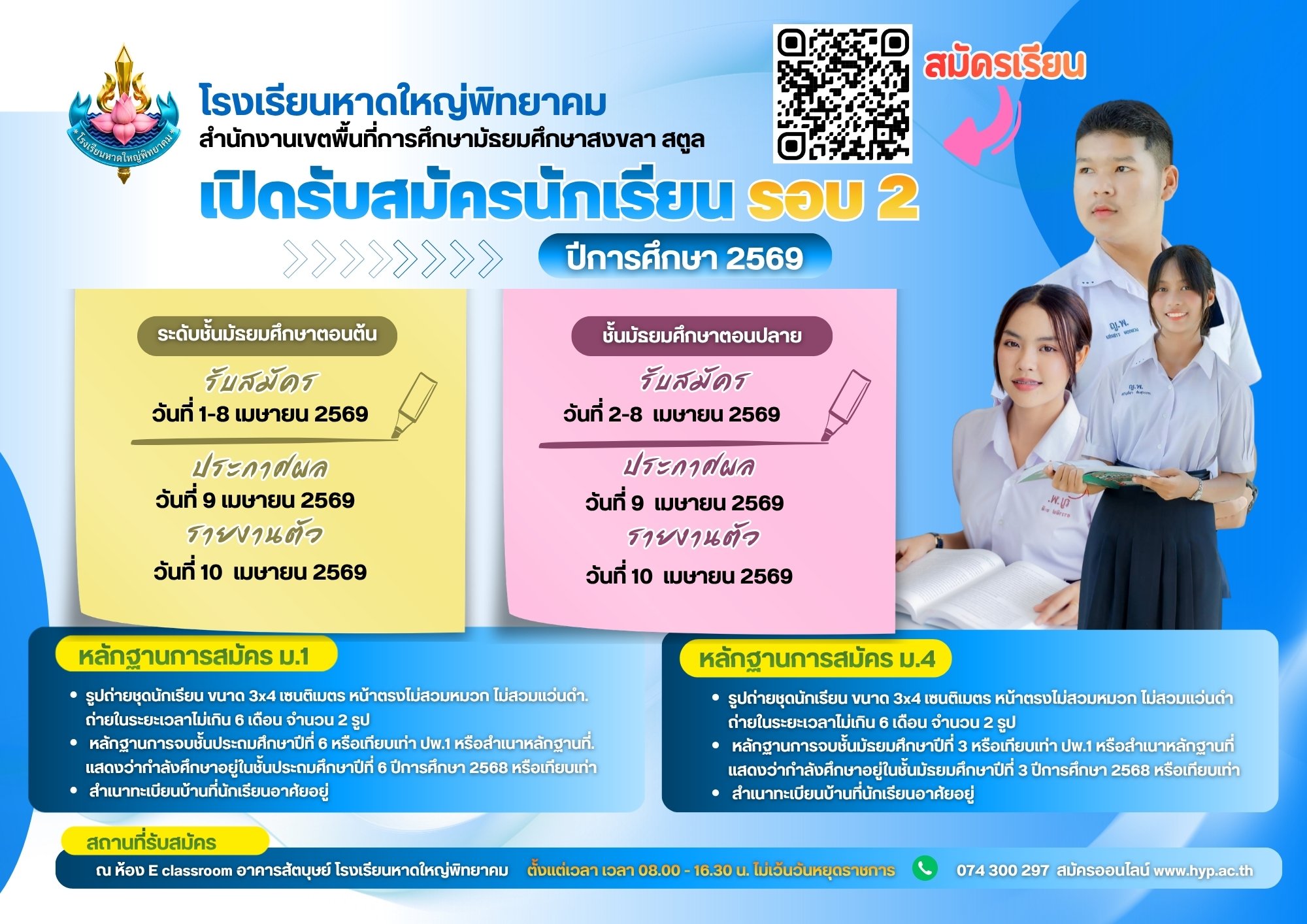 ประกาศโรงเรียนหาดใหญ่พิทยาคม การรับนักเรียนเข้าศึกษาต่อในระดับชั้นมัธยมศึกษาปีที่ ๔